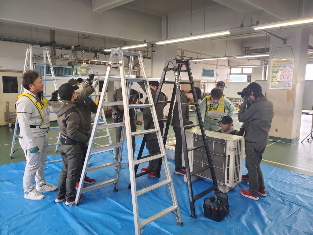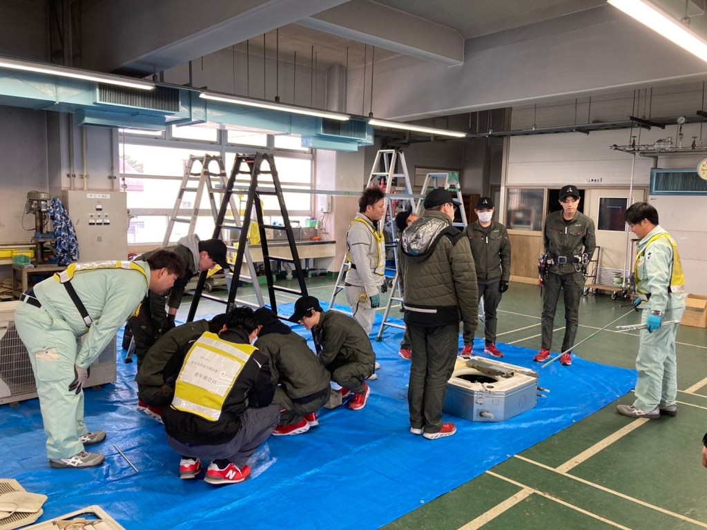 先日、青年部主催の「テクノアカデミー会津 空調機施工体験学習」の技術指導に参加させていただきました。12名の学生が参加され業務用エアコンの取付、冷凍サイクルの知識、フレア加工等、現場さながらの技術指導でした。学生さん達は家庭用エアコンとの違いや、普段は天井の中に隠れている室内機に興味を持ち施工体験に取り組んでいたと感じました。